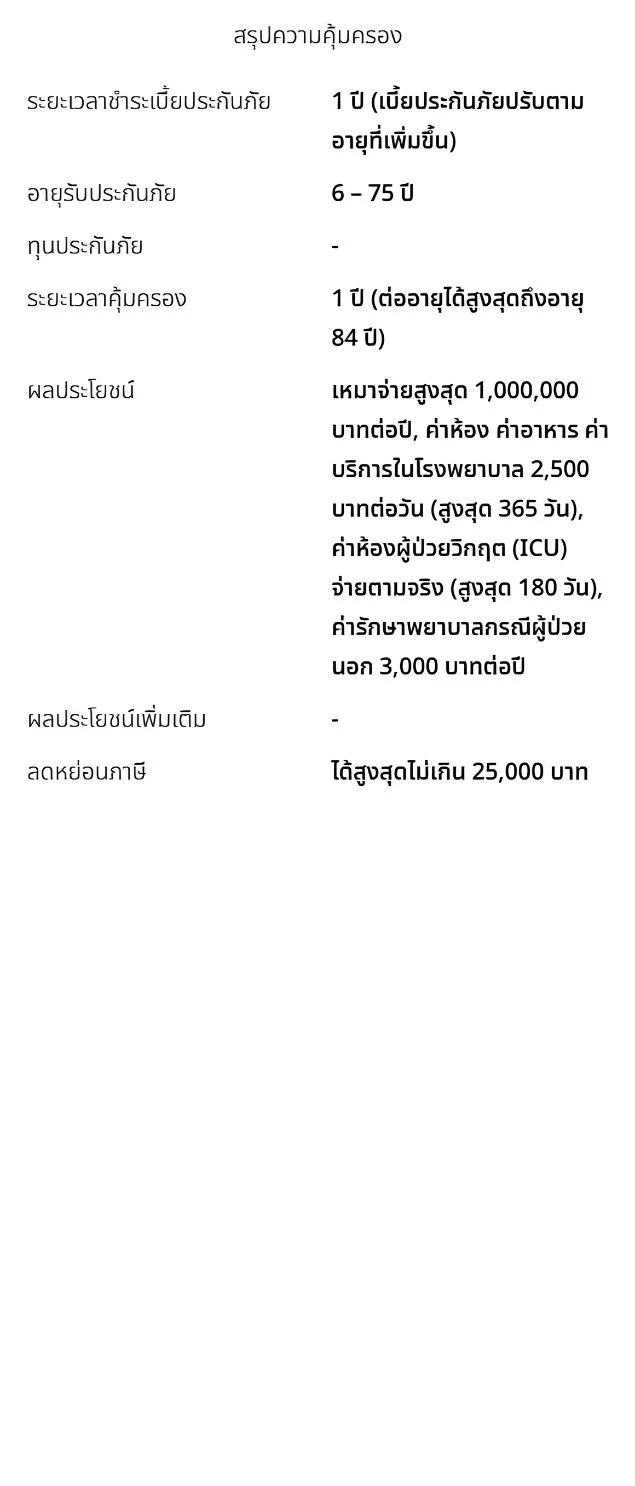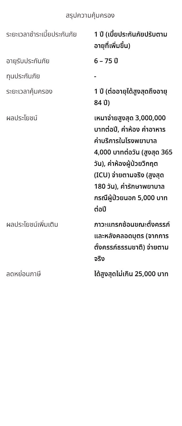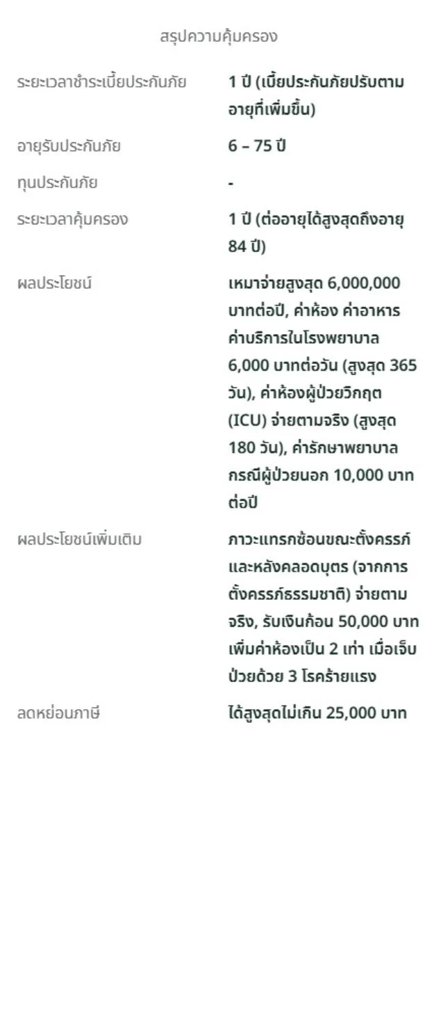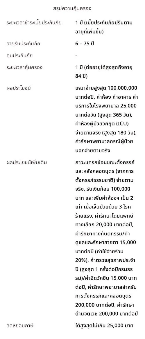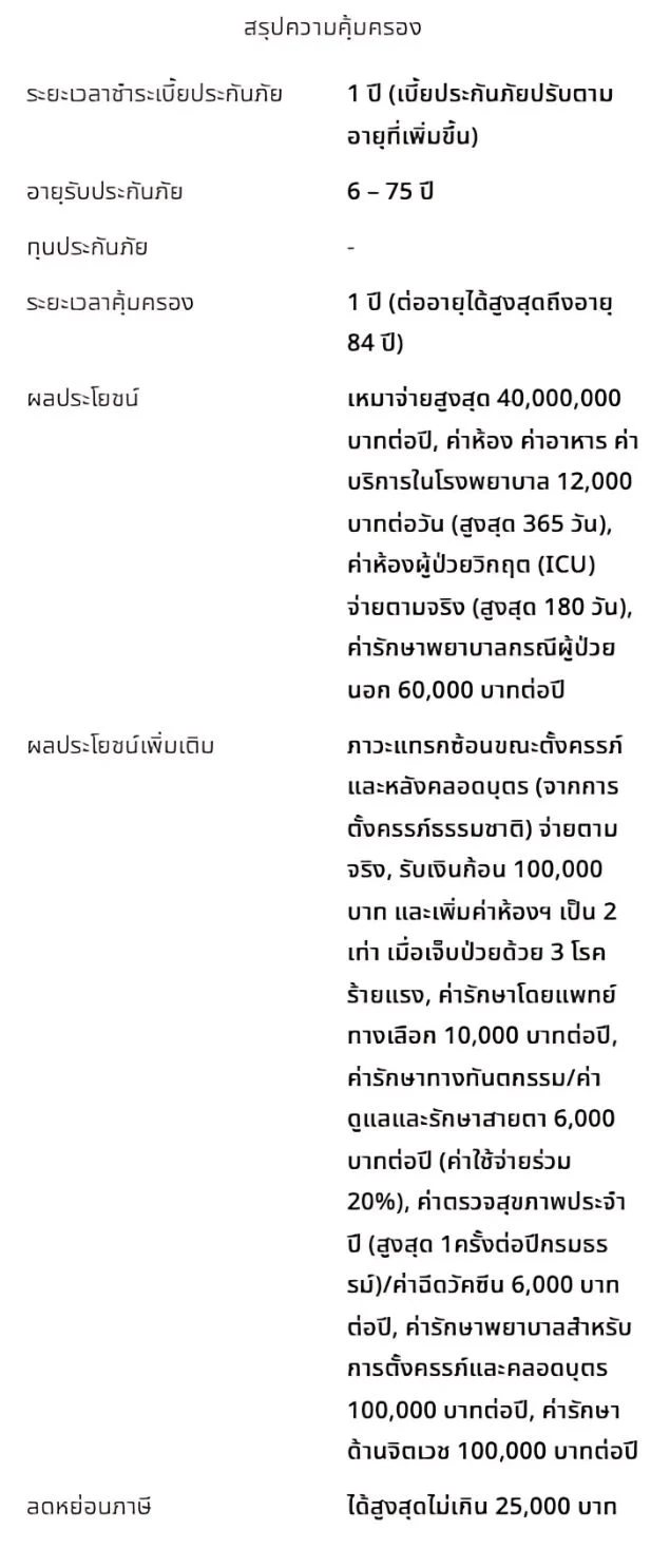 ประกันแบบไหนดี ที่เหมาะสมกับคุณ ประกันสุขภาพ เอฟดับบลิวดี พรีเชียส แคร์ เหมาจ่ายให้ครบ ครอบคลุมทุกค่ารักษาด้วยผลประโยชน์สูงสุด 100 ล้านบาทการเจ็บป่วยเป็นเรื่องที่ไม่สามารถคาดเดาได้ หากเกิดขึ้นสิ่งที่กังวลคือค่าใช้จ่ายในการรักษาแต่คุณสามารถวางแผนรับมือกับเรื่องดังกล่าวได้ หมดกังวลไม่ว่าป่วยหนักหรือป่วยเบา เราพร้อมดูแลครอบคลุมทุกค่ารักษา ด้วยผลประโยชน์แบบเหมาจ่าย เริ่มต้น 1 ล้านบาท สูงสุด 100 ล้านบาท ผู้ป่วยใน IPD คุ้มครองจัดเต็มดูแลครบอุ่นใจ หากต้องนอนโรงพยาบาล ค่ารักษาจ่ายตามจริง ผู้ป่วยนอก OPD มีให้ครบทุกแผนเหมาจ่ายตามจริง ตามวงเงินสูงสุดของแผนที่คุณเลือก ดูแลพิเศษ หากเจ็บป่วยด้วย 3 โรคร้ายแรง (ขึ้นอยู่กับแผนที่เลือก)โรคมะเร็งระยะลุกลาม โรคหลอดเลือดสมองแตกหรืออุดตัน หรือโรคกล้ามเนื้อหัวใจตายเฉียบพลันจากการขาดเลือด รับเงินชดเชยและเพิ่มค่าห้องเป็น 2 เท่า ครอบคลุมผลประโยชน์ค่ารักษาอื่นๆค่าผ่าตัดเปลี่ยนอวัยวะ ปลูกถ่ายไขกระดูก เคมี/รังสีบำบัด Targeted Therapy ล้างไต ศัลยกรรมเต้านม/องคชาตจากอุบัติเหตุหรือโรคร้ายแรง อิสระในการเลือกแผนความคุ้มครองได้ตามใจคุณในประเทศ/ทั่วโลกให้คุณเลือกแผนความคุ้มครองค่ารักษาด้วยผลประโยชน์แบบเหมาจ่าย ประหยัดเพิ่มขึ้น ด้วยแผนร่วมจ่ายค่ารักษาส่วนแรกทางเลือกสำหรับคนที่มีประกันสุขภาพแล้วและต้องการความคุ้มครองเพิ่มเติมให้ครอบคลุมค่ารักษาส่วนเกิน สนใจ ?ลองดูรายละเอียดทั้งหมด และติดต่อเราหากมีคำถามใดๆ เอฟดับบลิวดี พรีเชียส แคร์ (แผนบรอนซ์) เอฟดับบลิวดี พรีเชียส แคร์ (แผนซิลเวอร์) เอฟดับบลิวดี พรีเชียส แคร์ (แผนโกลด์) เอฟดับบลิวดี พรีเชียส แคร์ (แผนแพลทินัม) เอฟดับบลิวดี พรีเชียส แคร์ (แผนแซฟไฟร์) เอฟดับบลิวดี พรีเชียส แคร์ (แผนไดมอนด์) โบรชัวร์ผลิตภัณฑ์รับโบร์ชัวร์ผลิตภัณฑ์ สำหรับใช้ในการพิจารณาส่วนตัว หรือแบ่งปันให้กับเพื่อนและครอบครัว ดาวน์โหลดโบรชัวร์แผนบรอนซ์-แพลทินัม ดาวโหลดโบรชัวร์แซฟไฟร์-ไดมอนด์ สนใจสอบถามรายละเอียดเพิ่มเติมเพื่อความรวดเร็วในการให้บริการกรุณากรอกรายละเอียดให้ครบถ้วน ชายหญิงเลือกความสนใจ *สนใจประกันชีวิต/สุขภาพสนใจสมัครตัวแทนส่งข้อความ ข้อมูลของท่านจะถูกเก็บเป็นความลับ กรุณากรอกรายละเอียดให้ครบถ้วน